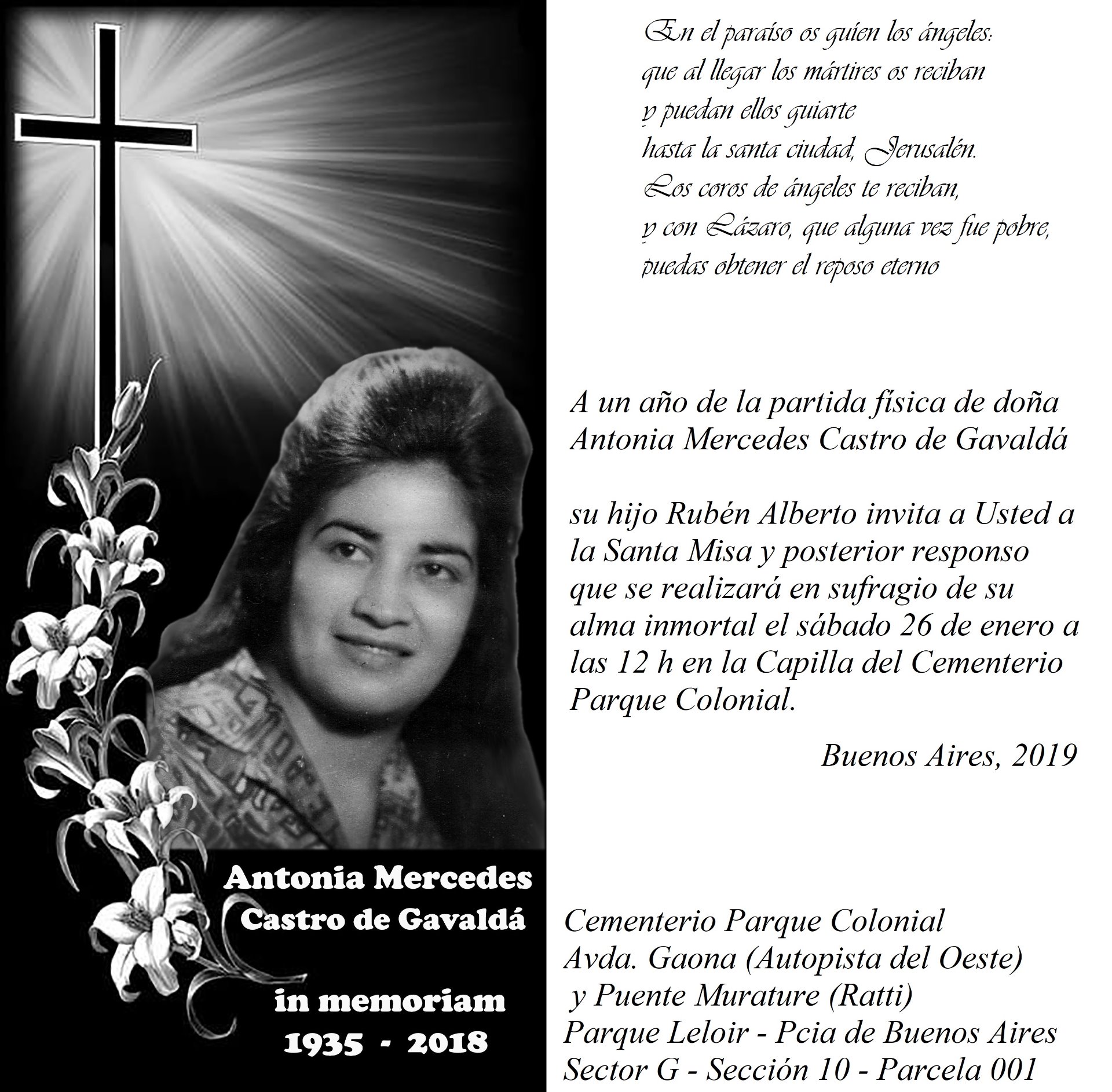 La Casa Condal de Ituarte invita a la Santa Misa y posterior responso que se oficiará en sufragio del alma de + doña Antonia Mercedes Castro de Gavaldá el sábado 26 de enero de 2019 a las 12 h en ocasión de conmemorarse el primer aniversario de su paso a la inmortalidad.